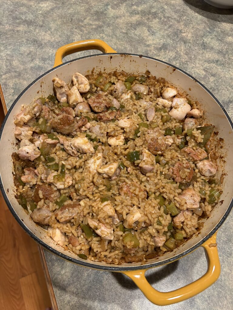 This started as an Internet recipe, probably from The Food Network or similar. The creole seasoning is Emeril Lagasse’s so it would stand to reason the recipe is too. It was made on the stove in a large sauté pan and started with the vegetables, then stock, then rice with the seasoned (raw) meat added in the latter stages to cook in the rice. The issue I had with the recipe is that I couldn’t leave the dish alone and often stirred it too much, which made the rice a bit mushy.